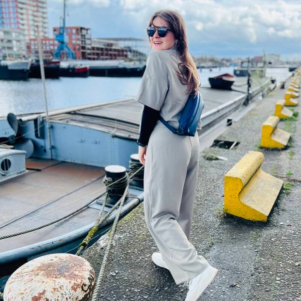 Heuptasje met rits, voorzakje en achterzakje. Zachtblauw leder.