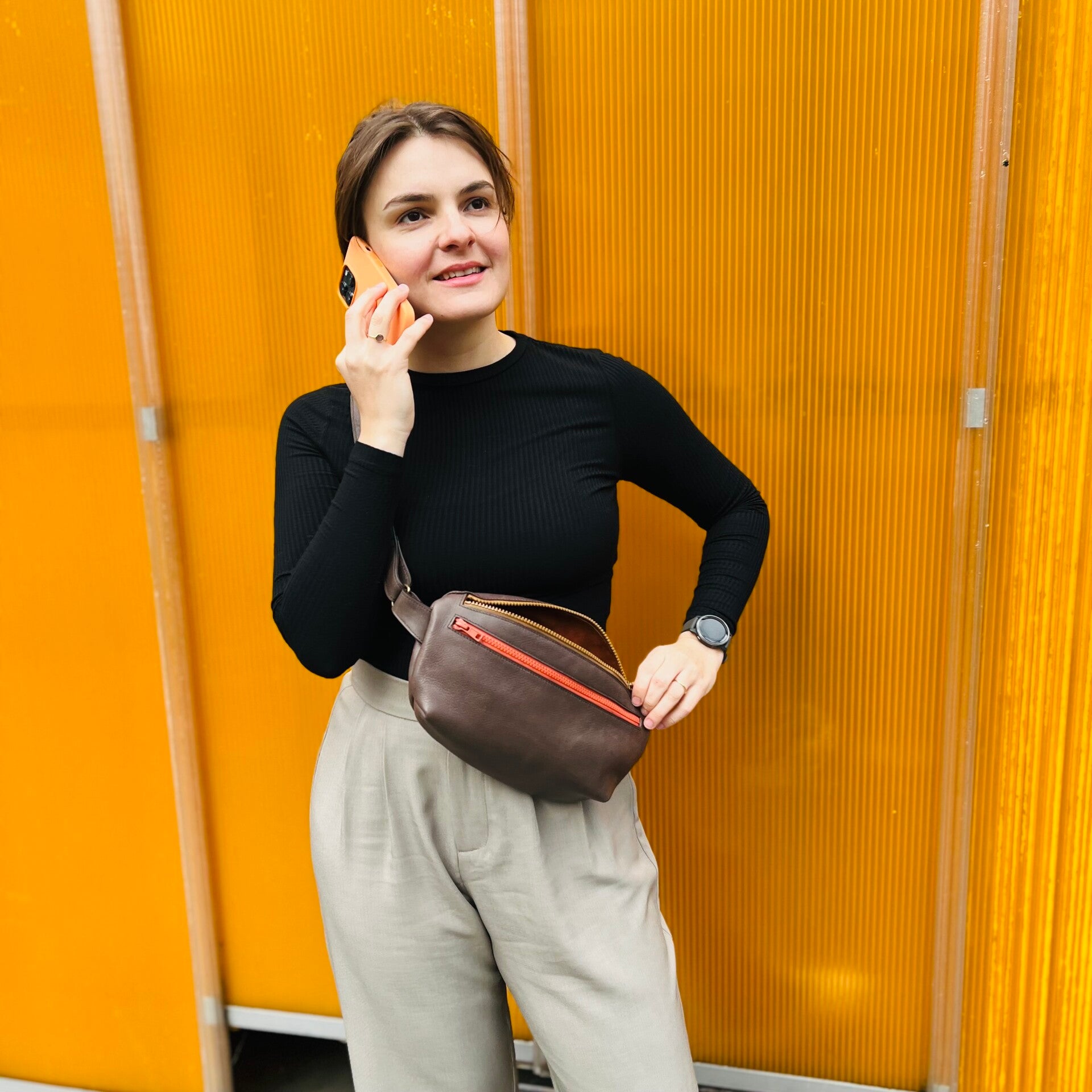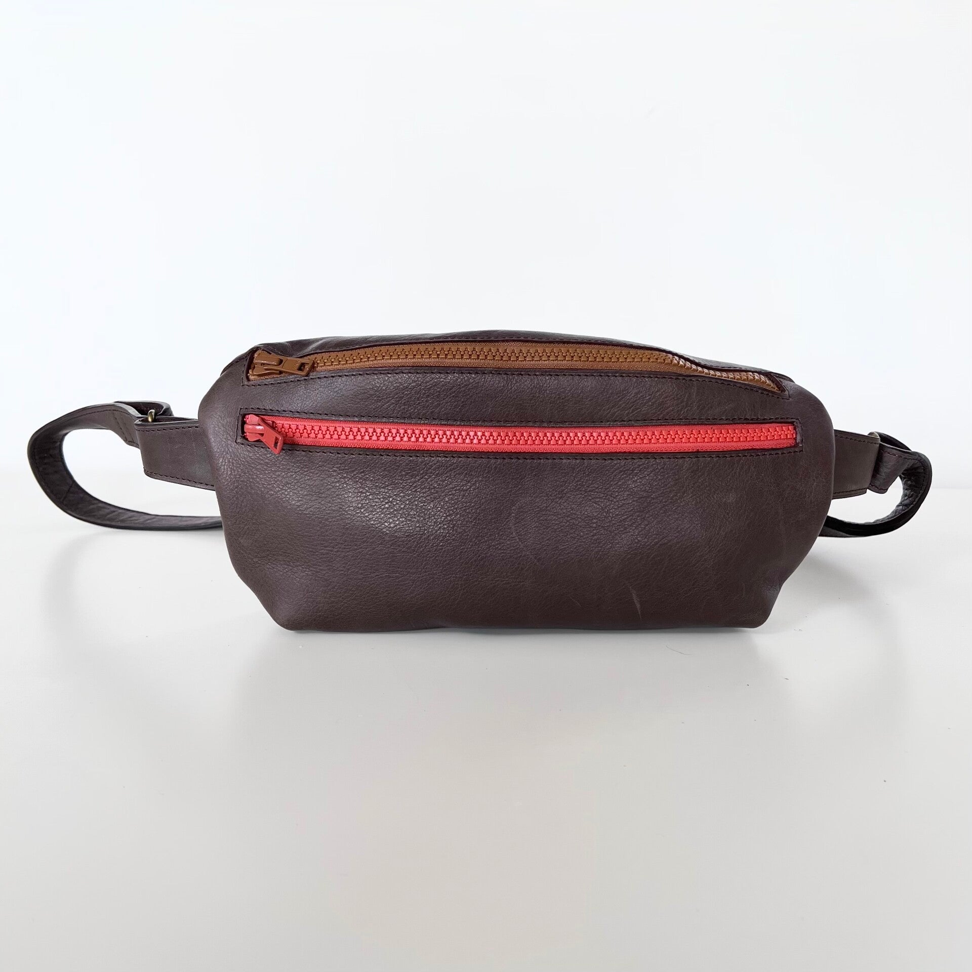 Heuptasje met ritsen (in verschillende kleuren), voorzakje en achterzakje. Bruingrijs leder.