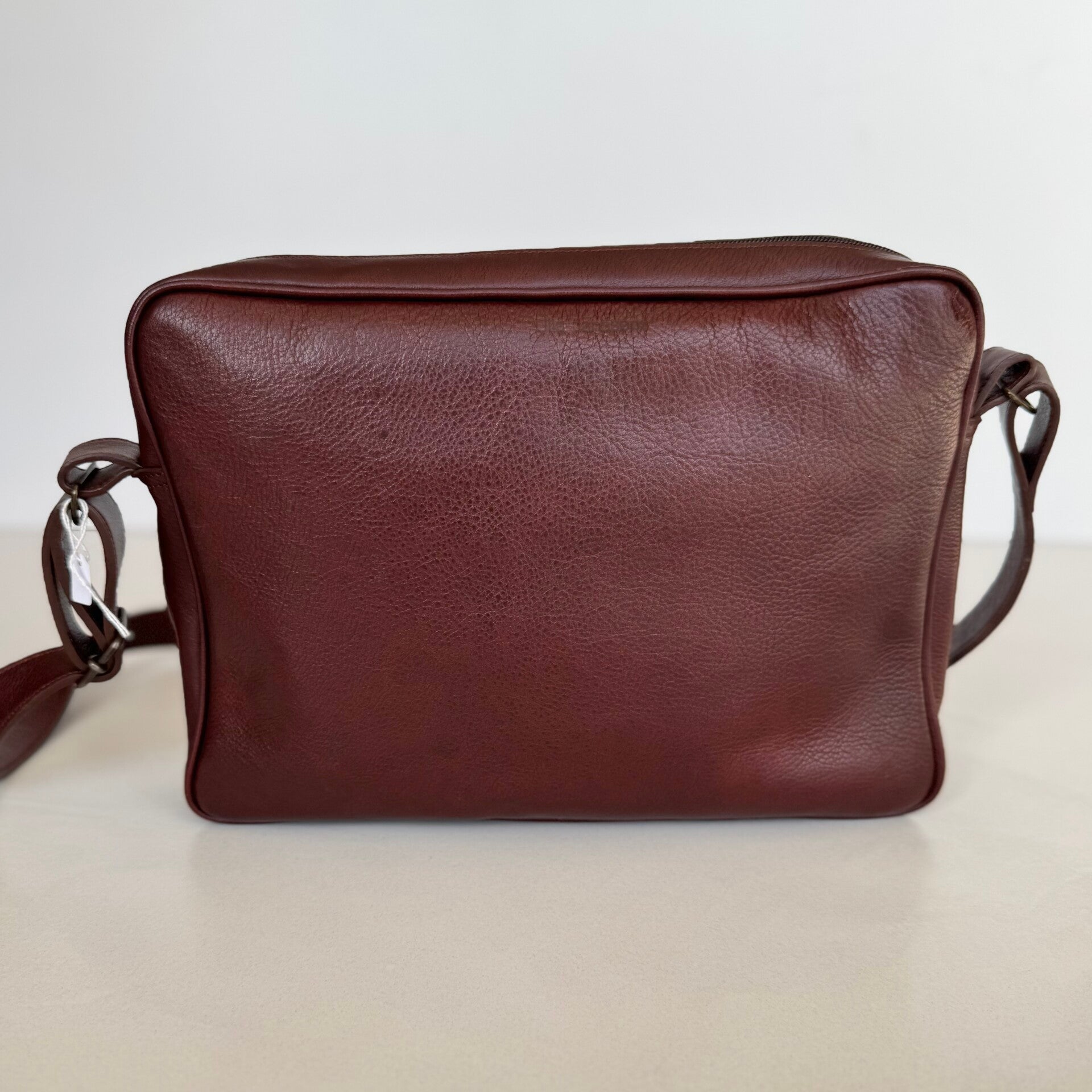 Schoudertas met lange riem in bruin leder. Afmetingen: 33X24x6 cm. Binnenzakje met rits.