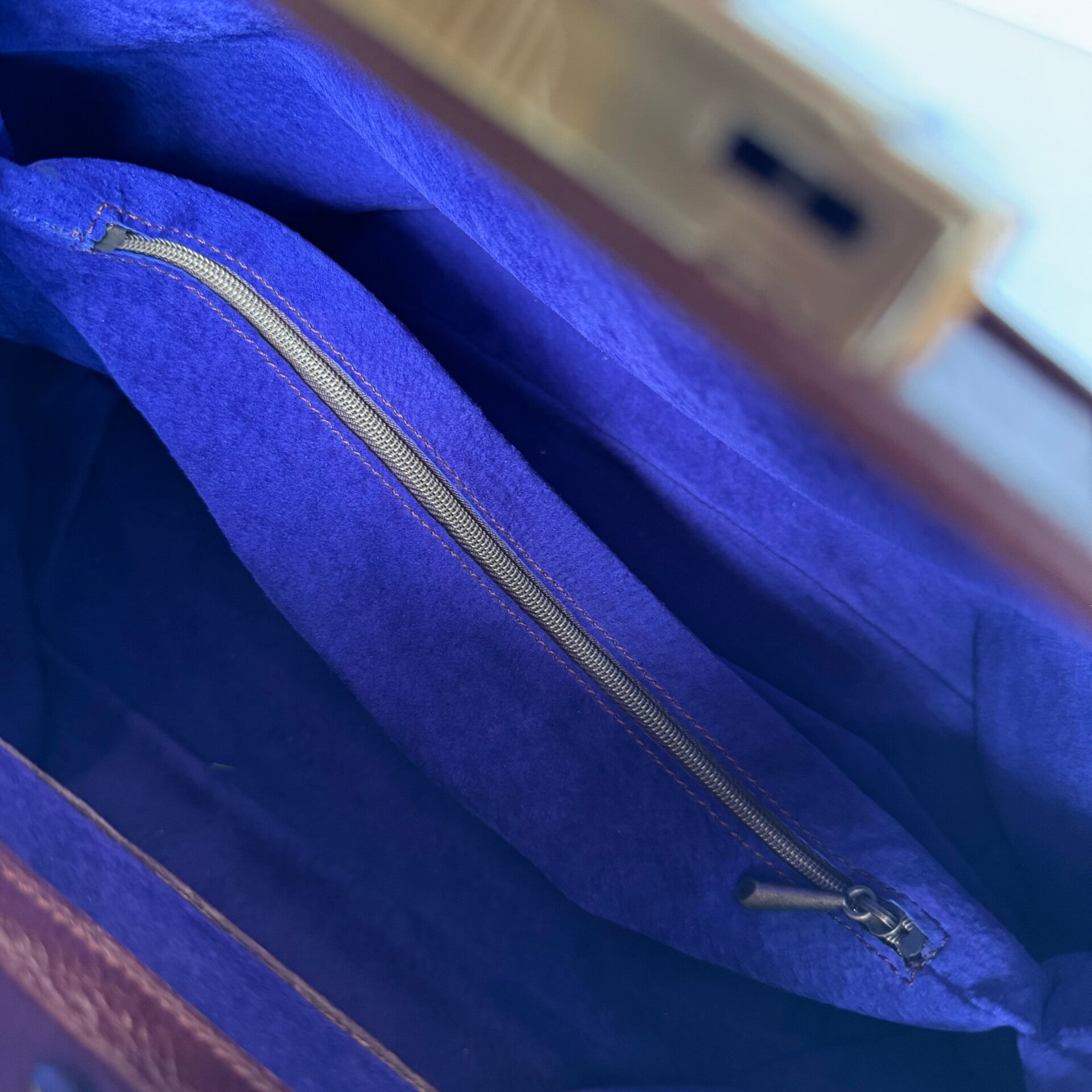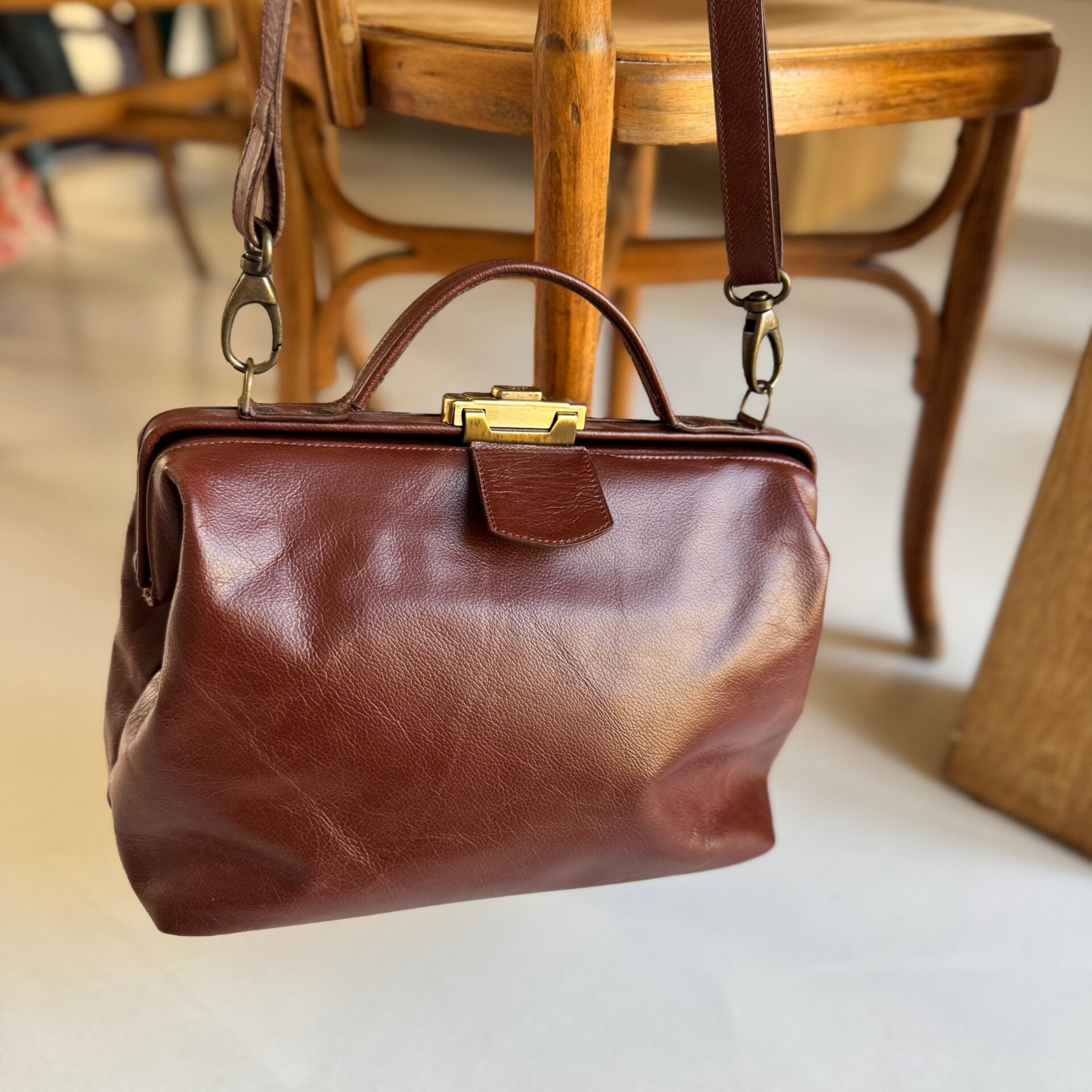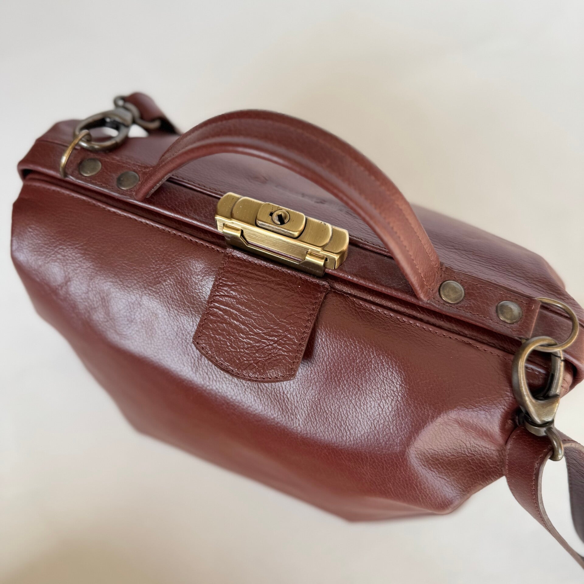 Bruine dokterstas, klein formaat, met binnenzakje. Paarse voering.