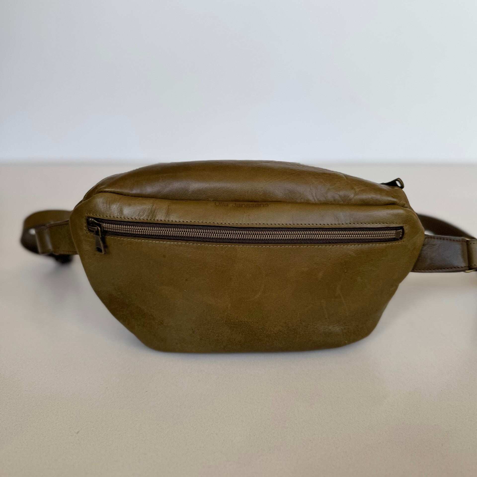 Kakigroene crossbodytas met voorzakje en achterzakje. Pièce unique.