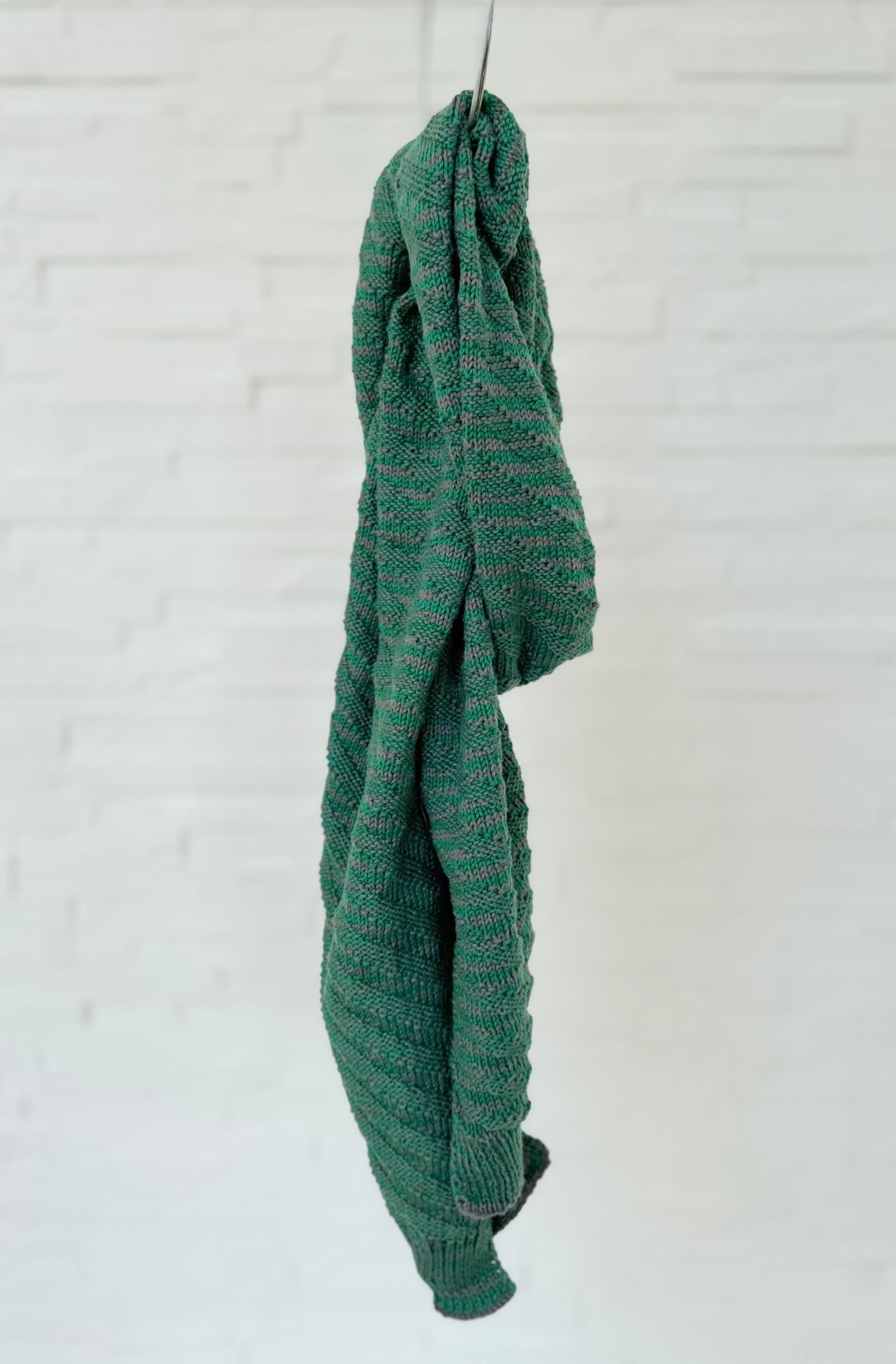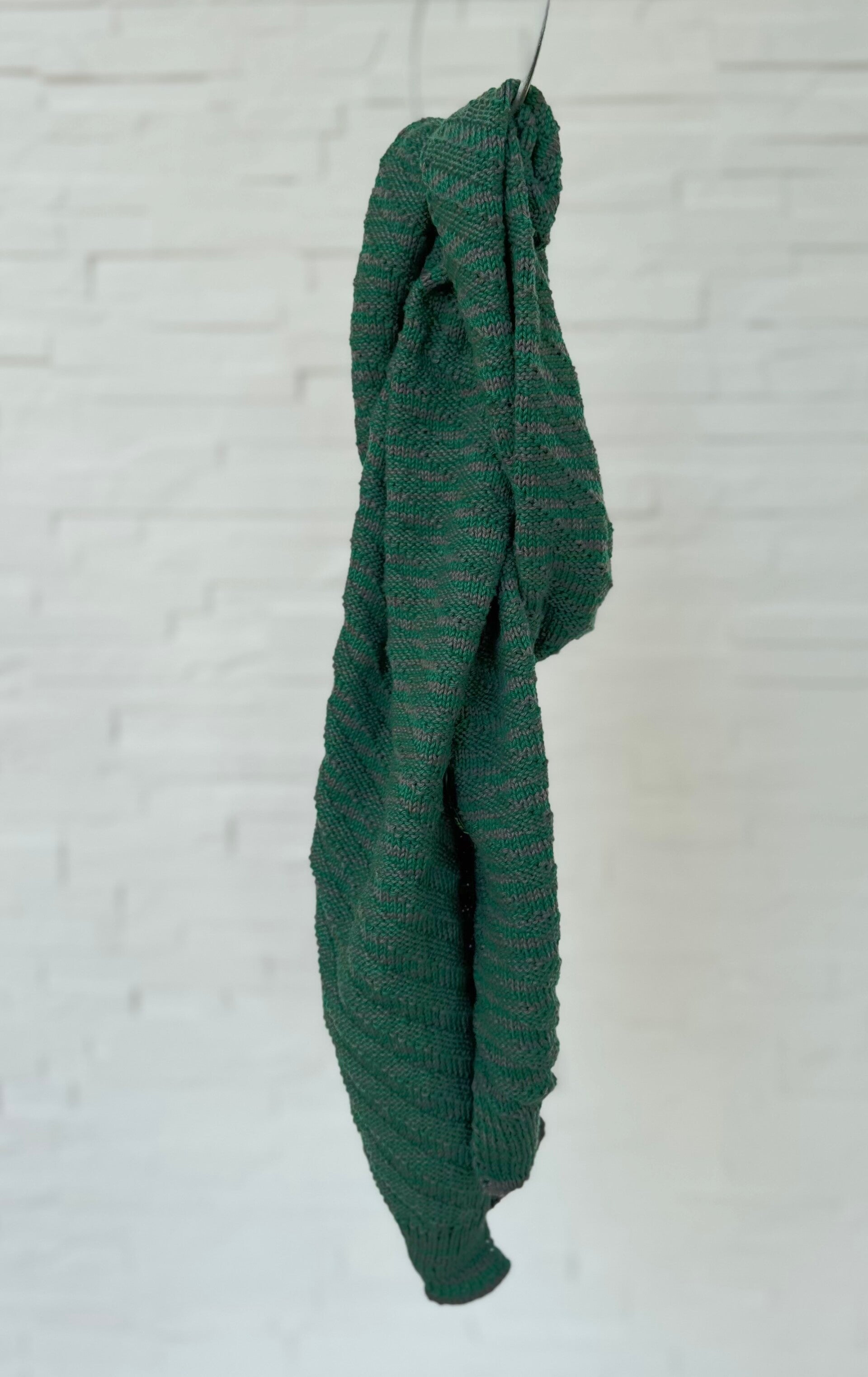 Handgebreide sjaal groen/grijs in 100% katoen. Afmetingen: 167x23 cm.