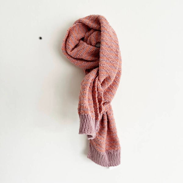 Handgebreide sjaal roze/lila. 60% katoen, 40% acryl. 145x28 cm